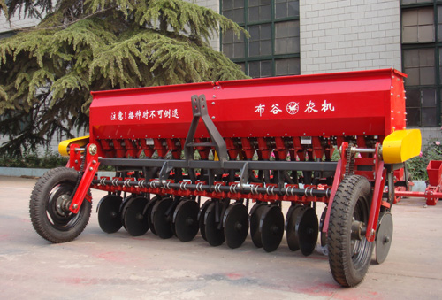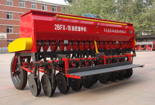 2BFX-18播种机适用于麦类、谷子、高粱等作物的条播,并可兼播大豆,播种的同时可以施下化肥。播种量、施肥量、播种深度、行距均可根据农业技术要求进行调整。 本机采用三点悬挂装置与拖拉机挂接,运输方便。 本机采用外槽轮排种器、排肥器,排种轮、排肥轮、阻塞轮为粉末冶金件,具有耐热、耐寒的优点。采用波纹橡胶输种管,下种流畅;采用钢制双轴承开沟器,工作可靠。采用手轮调节播种深度,使用方便。 传动部分由橡胶轮、链轮和链条组成,可靠耐用,可适于高速作业。